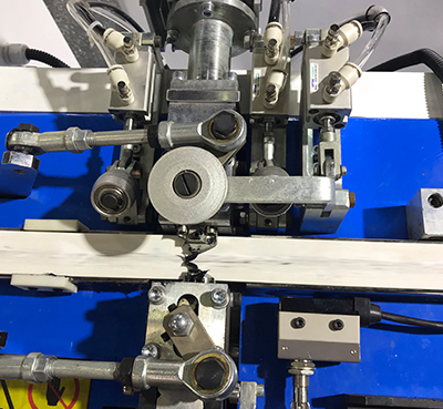 3、擺動氣缸動作、壓輪壓下,壓送鋁間隔框行進,當間隔框到達打膠頭時打膠,將膠均勻地涂在鋁間隔框上。