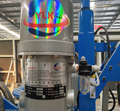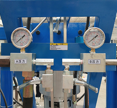 采用可調(diào)式增壓同步聯(lián)動配比機(jī)構(gòu)。適應(yīng)不同物料的配比要求(6:1-14:1),有專門比例檢測機(jī)構(gòu),配比調(diào)整十分方便,配比精度誤差小于±2%。